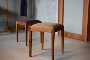 ナラ無垢材の脚部に、ヘリンボーン柄のウール100%生地で張りこんだ座面を組み合わたスツールです。とても軽く作ってあります…
