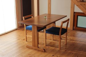 シェーカースタイルの2本脚のダイニングテーブルです。テーブルの脚が天板下中央にあるので、席を立つときテーブルの脚が邪魔に…