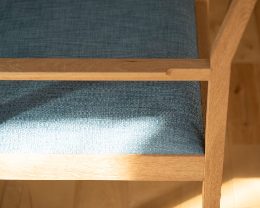 イギリスのカークビーデザイン社の生地を張りこんだ座面は座り心地もよく、ヴィンテージ感と気品を感じさせます。